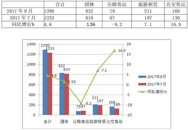 2018年7月份国内考斯特市场累计销售1290辆,与2017年同期相比有所增长。作为政府、企事业单位、公检法司、星级酒店接待等团体市场累计销售832辆,占据考斯特市场64.4%的市场份额,处于垄断地位,但由于政府部门费用控制比较严格,公务用车得到限制,同比还是出现了下降(2017年同期占比为66%)。公路、旅游市场占据考斯特市场的22.5%左右(2017年同期为23%)份额,同比微降;而公交客运增幅最大,但基数较低,仅占市场份额的13%左右(2017年同期占比为10.5%,详见上表,数据来源:车管所上牌数)。新一届国家领导人上台后,尤其十九大后大力推进并贯彻落实《八项规定》,在公费旅游、接待用车等方面严格管控,在一定程度上影响了公务用车市场对考斯特用车需求。