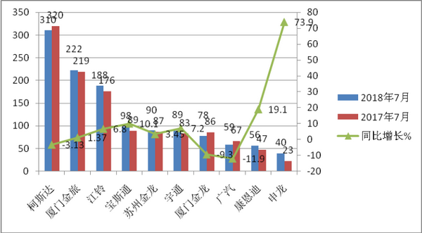1、 自主品牌中厦门金旅表现尚可,2018年7月累计销售222辆,与去年同期相比增长1.37%,销量仍然是国产品牌中最大。