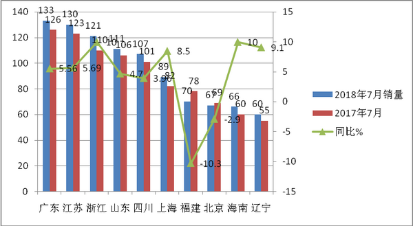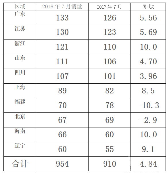 3、2018年7月销量前10名各区域市场销量增幅统计%(来源上牌数据)