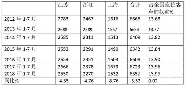 2018年前7月江、浙、沪座位客车市场五特点简析