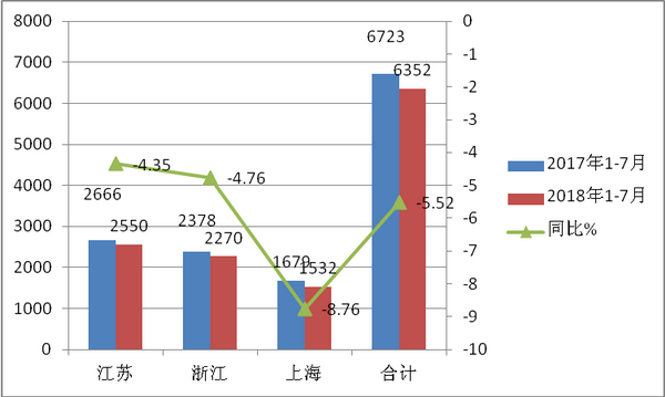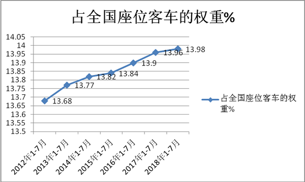 1、近7年1-7月江浙沪区域座位客车的销量在前4年是下降的,到了2016年1-7月后却出现拐点。但占据全国座位客车的市场权重却一直呈现上升态势,即从2012年的13.68%一路上升到2016年1-7月的13.9%,2017年销量同比微增,2018年销量同比又下降,但权重一直都在上升。