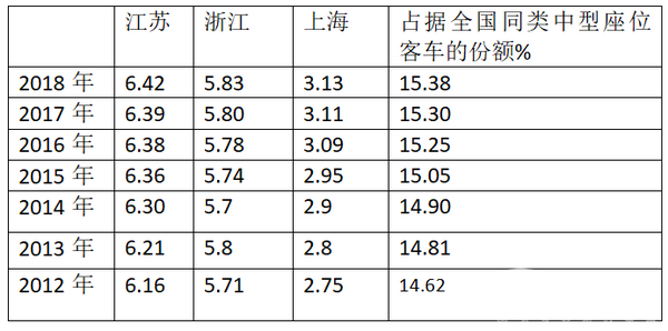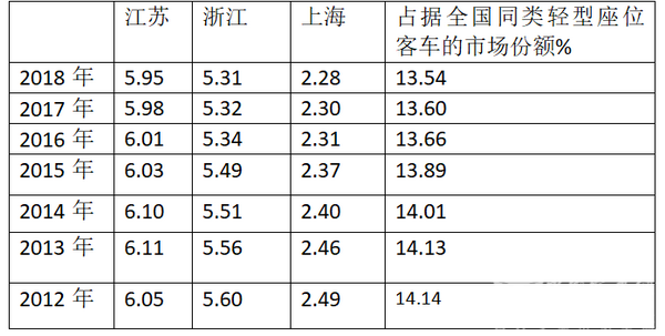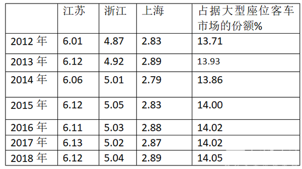 3、近年来高铁、动车不断增加,根据统计,经过江浙沪地区的高铁、动车趟数比以前就增加了30%以上,这无疑会抢走很多本属于座位客车的客源,因此,从2012年6月就出现了座位客车销量下降的现象,但全国的座位客车市场近几年都在下降,而江浙沪地区由于需求较大、购买力较强,因此座位客车市场份额不降反升。