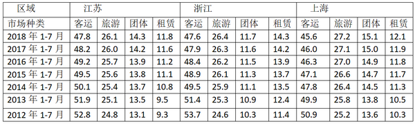 近7年1-7月,江浙沪区域,座位客车中的市场份额都在逐步下降,而旅游、团体、租赁与客运市场相反,均在上升。即座位客车中传统占主体地位的客运市场有向旅游、团体、租赁等市场转移的迹象。