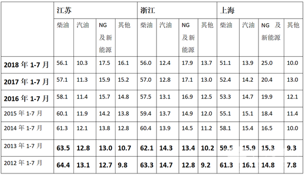 1、按动力种类划分,在2018年1-7月到2012年1-7月的座位车销量结构中,江浙沪地区普通柴油依然是主体部分,占据三大城区域销量的比例大约在51-58%之间,而且这一比例呈现逐年下降态势。