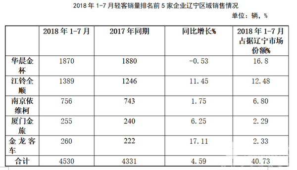 2018年前7月辽宁区域轻客市场四点解读