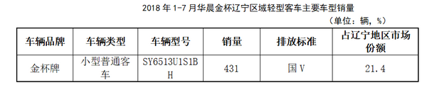 2018年1-7月,辽宁地区华晨金杯SY6513U1S1BH轻型客车共销售400辆,占该汽车企业2018年1-7月辽宁地区总销量的21.4%。