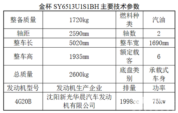 从主要技术参数来看,金杯SY6513U1S1BH轻型客车配备的发动机为4G20B汽油发动机,4G20B该发动机最大的优势就是技术成熟、动力强劲、高效省油,其次是结构紧凑、噪声低、振动小。