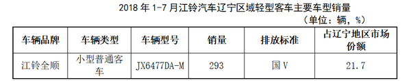 2018年1-7月,辽宁地区江铃全顺JX6477DA-M轻型客车共销售302辆,占江铃汽车有限公司2018年1-7月辽宁地区总销量的24%。