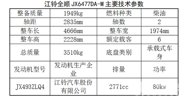 从主要技术参数来看,江铃全顺JX6477DA-M轻型客车配备的发动机为JX493ZLQ4柴油发动机,采用高压共轨技术,共轨腔内的高压直接用于喷射,可以省去喷油器内的增压机构;而且共轨腔内是持续高压,高压油泵所需的驱动力矩比传统油泵小得多。通过高压油泵上的压力调节电磁阀,可以根据发动机负荷状况以及经济性和排放性的要求对共轨腔内的油压进行灵活调节,优化了发动机的低速性能。