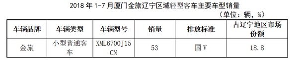 2018年1-7月,辽宁地区厦门金旅XML6700J15CN轻型客车共销售48辆,占该汽车企业2018年1-7月辽宁地区总销量的18.8%。
