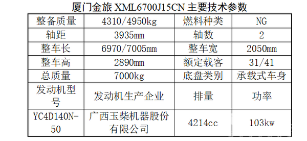 从主要技术参数来看,厦门金旅XML6700J15CN配置的发动机为广西玉柴机器股份有限公司生产的YC4D140N-50系列气体机,电控系统采用自动单点喷射,可有效减少气体损耗,噪声小,主要适用于6.6-8m客车、4×2公路货车等。