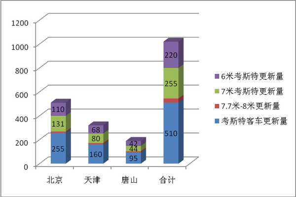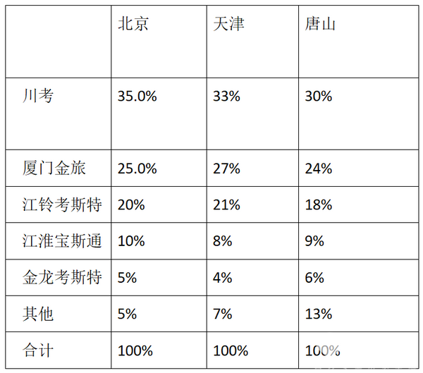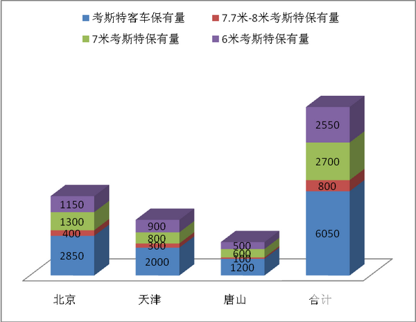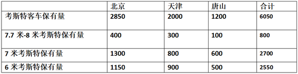 根据市场调研,目前京津唐地区的考斯特市场保有量大致如下表(单位:辆):