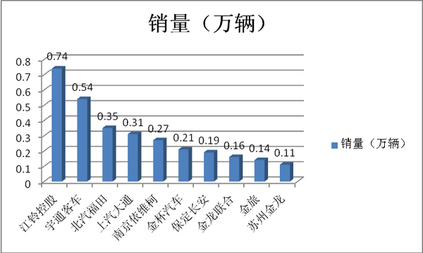 销量排名前十位的企业依次为:江铃控股、郑州宇通、北汽福田、上汽大通、南京依维柯、金杯汽车、保定长安、金龙联合、厦门金旅和苏州金龙,分别销售0.74万辆、0.54万辆、0.35万辆、0.31万辆、0.27万辆、0.21万辆、0.19万辆、0.16万辆、0.14万辆和0.11万辆。与上月相比,保定长安、金龙联合和厦门金旅销量均呈较快下降,其他企业呈不同程度增长,除金杯汽车增速略低外,其他企业增速均呈两位数快速增长。8月,上述十家企业共销售3.02万辆,占客车销售总量的82.07%。