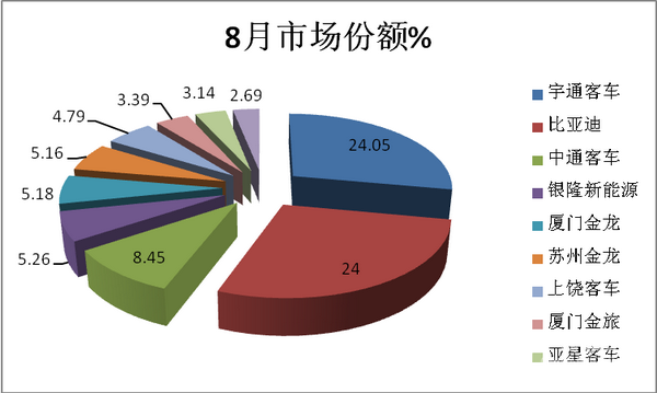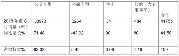 从客车类别来看,今年1-8月份,新能源公交车累计销售38973辆,同比增长71.48%;新能源座位客车销售2264辆,同比下降43.92%;校车和“其他”车型分别销售34辆和484辆,二者市场份额之和不到1.3%。显然,公交车和座位客车是新能源客车市场的主力车型,其中新能源公交车市场表现最为给力,不仅权重最大,前8月新能源客车市场增长的最大动力。