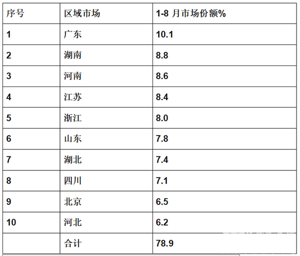 特点五:区域流向分布不均,广东是市场份额最大区域,其次是湖南,再次是河南;前10名区域市场集中度达到78.9%