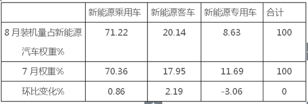 特点二:新能源客车装机量权重环比增加2.19个百分点 ,在新能源汽车中,权重环比增幅最大