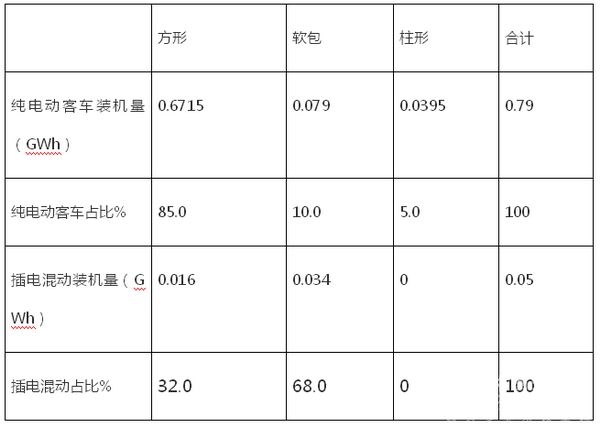 特点五:纯电动客车中,方形电池装机量最大;插电式混动客车中,软包型电池装机量最大