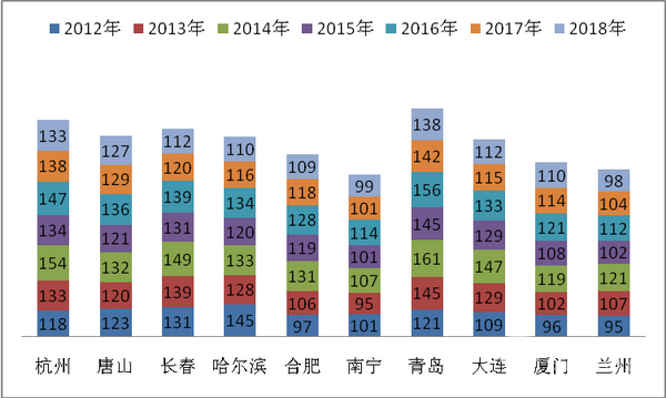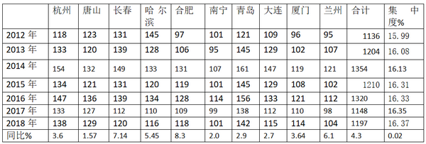 1.杭州、唐山、长春、哈尔滨、合肥、南宁、青岛、大连、厦门、兰州等十大二线城市近7年1-8月10-11米公交的市场份额总和均在16%左右上下振荡。2018年市场份额最大为16.37%,2012年最小为15.99%。2018年前8月销量同比均下降,但十大二线城市10-11米公交的市场集中度同比提高了0.02个百分点,一方面说明了十大二线城市的10-11米公交采购量每年都大约在市场总体需求的六分之一左右,可谓举足轻重,另外也说明2018年前8月十大二线城市10-11米公交的垄断程度在加强。