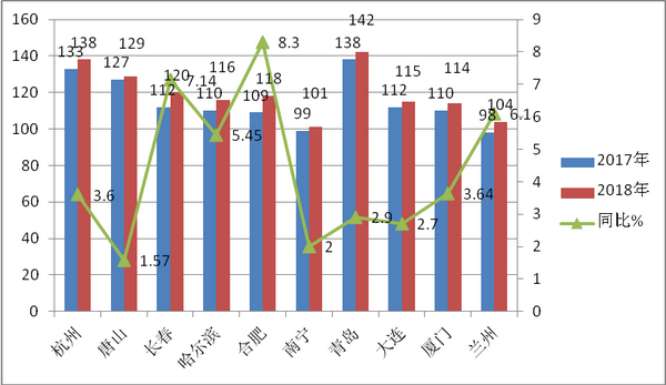从上图表可知,近7年1-8月规律比较明显,即在2012年后就一直呈现上升态势,从2012年的最低谷21.45%逐年上升到2018的23.35。但近7年来比例始终都在20%以上25%以下,即近7年来10-11米公交占据当年公交总量的比例始终超过五分之一,但又不足四分之一、杭州等十大城市10-11米公交市场具体特点如下: