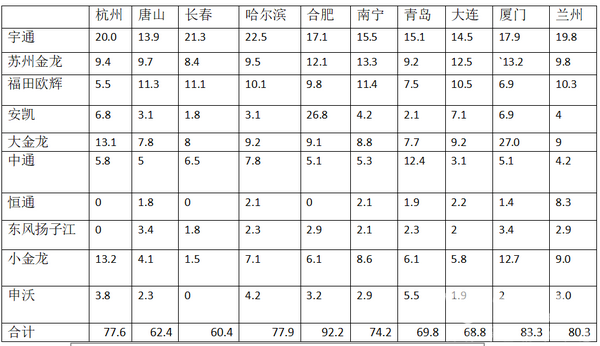 4、总体看,宇通在十大城市中的10-11米公交市场份额最高,不愧为第一客车品牌。