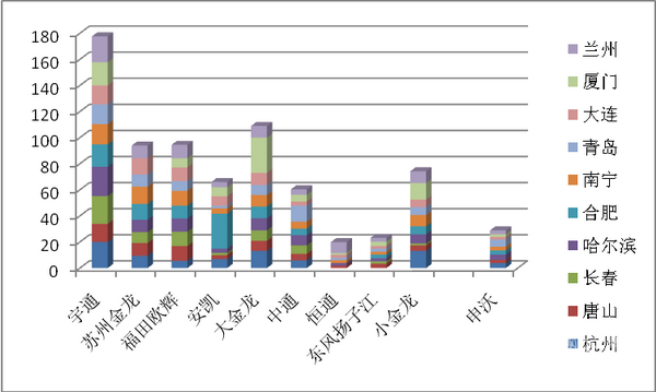 2、主流企业在合肥的10-11米公交市场集中度最高,达到了92%左右,其次是东南沿海的厦门83.3%,再次是大西北的兰州80.3%。