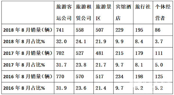 按目标客户行业划分,2018年8月及近两年同期旅游客车销量结构统计表,表1