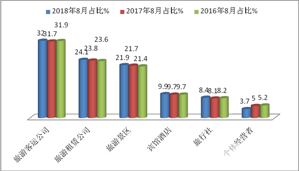 4、宾馆酒店、旅行社、个体经营者分别位居第四、第五、第六,且同比2017年、2016年8月均有不同程度的增长趋势,近3年也是呈现逐年稳中有增的发展态势。
