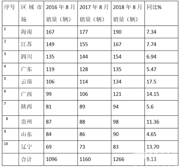 1、2018年 8月在全国销量位于前10名旅游客车市场的海南、江苏、四川、广东、云南、广西、陕西、贵州、山东、辽宁等10个区域市场中,共销售了1266辆旅游客车,占据了8月份旅游客车54.66%的市场份额,而2017年8月只有52.3%的市场份额,集中度提高2.36个百分点,集中度明显加强。这说明一方面旅游客车市场不可能象高档客车那样集中度那么高,相反,旅游客车市场的集中度不高说明全国的各个市场对旅游客车来说都有机会,这也进一步证明了旅游客车产品为什么每个客车厂家都有销售,每个区域市场都能看到旅游客车在运营的主要原因了;另外一方面重点区域的垄断程度又在加强。