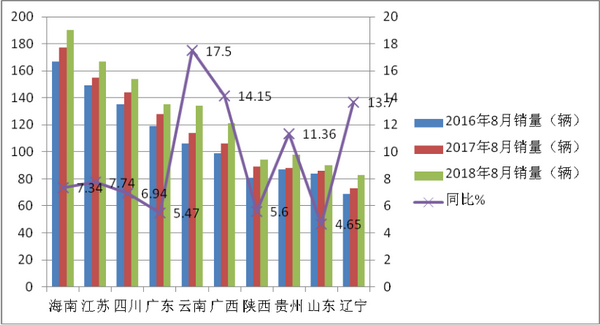 2、在前10个旅游市场中,海南是市场份额最大的旅游区域市场,主要因为该区域有三亚等著名的旅游休假城市,而且海南国际最大的旅游岛屿,销量同比上升7.34个百分点。 3、其次是江苏区域,是旅游客车销量第二大的区域, 2017年8月同比提高了7.74个百分点。是2017年8月主要区域市场中增幅幅度较大的市场之一。