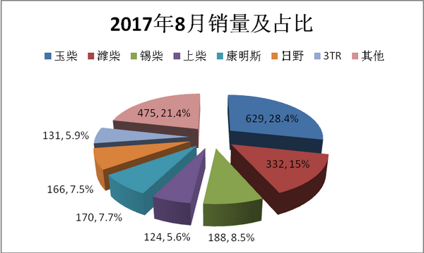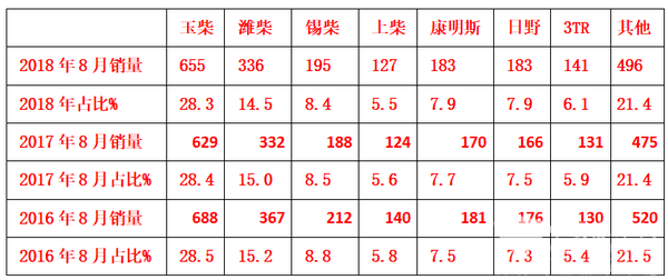 1、2018年8月客车销量中,玉柴占比最大,但同比下降,其他国产发动机品牌占比同比均下降。