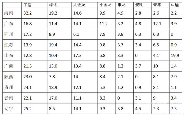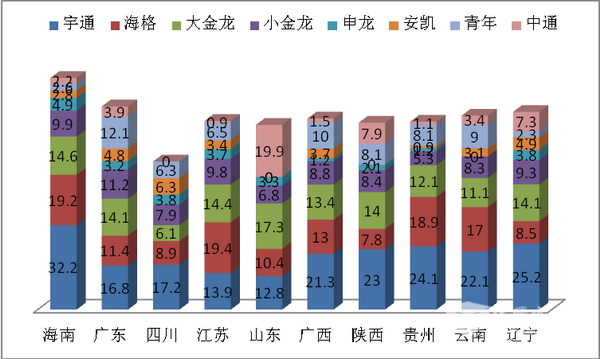2、 在上述所列的10个主流区域市场中,作为第一旅游大市场的海南,垄断程度最高,旅游客车市场竞争最不充分,其中宇通市场份额接近三分之一,海格客车市场份额接近五分之一,大小金龙的市场份额也不低,可以说,海南旅游客车市场基本是三龙一通的天下。