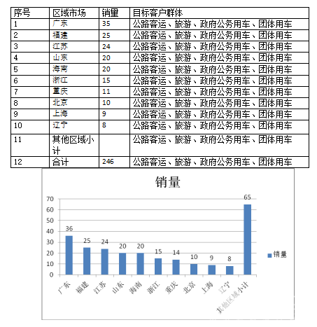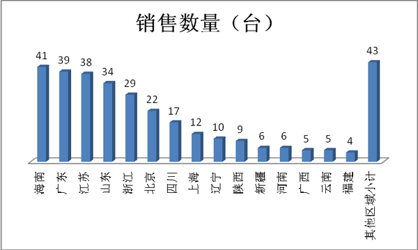 简析:丰田考斯特2018年8月的重点销售区域是海南、广东、江苏、山东、浙江、北京、四川、上海、辽宁、陕西、新疆等区域市场。同时也说明了上述区域市场是高端考斯特客车需求的重点区域市场,这给国内生产制造考斯特的客车企业在市场营销策略制定和重点资源投放上提供了一定的启示。