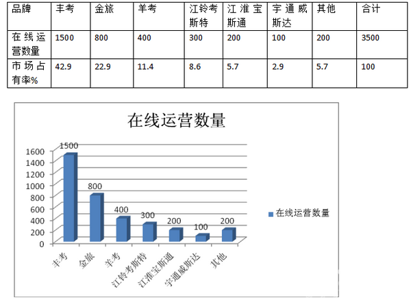 1、各品牌7米考斯特车型在广东的市场占有情况。根据笔者实地了解,目前广东区域市场拥有考斯特车型大约3500辆(含宇通7米多的威斯达车型)左右在线路运营,其中丰田考斯特(以下简称丰考)大约在1500辆左右。其余2000辆主要是国产品牌的7米仿考车型,主要品牌有厦门金旅、羊考(广汽考斯特)、宇通威斯达、江铃考斯特、江淮宝斯通等。主要品牌的拥有量分布情况大致如下表: