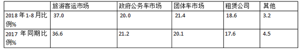 2、 其次是团体用车,但同比增长了1.3个百分点;再次是政府用车市场,同比下降了1.2个百分点;第四是租赁公司用车用车,同比上升了1.0个百分点。