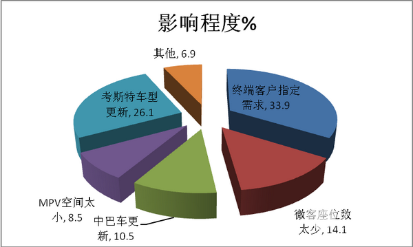 租赁公司用户需求考斯特车型的比例最大的群体是终端客户的指定需求;其次是原有的7米中巴车型使用到期,需要更新车型,再次是目前使用的中巴车型落后需要更新;还有就是及目前正在使用的微客车型空间太小,不受客户青睐,这些都是租赁用户需求7米考斯特车型的内在需求因素。同比可知,终端客户需求及考斯特车型更新、中巴车型更新等影响程度更大。
