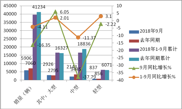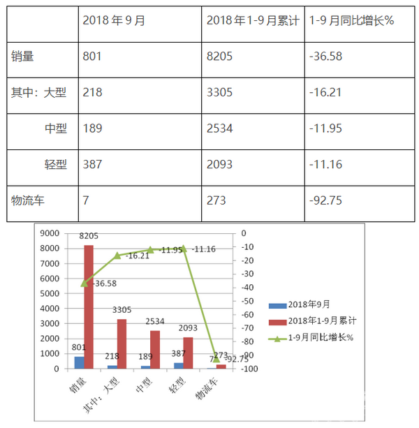 三、累计销量同比大降36.85%,大中轻客车累计销量同比均下滑;物流车销量同比大跌眼镜---2018年前9月中通客车销量点评