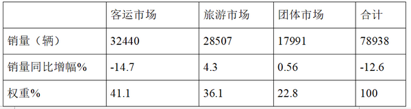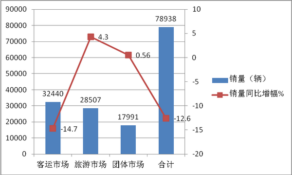 特点二:座位客车市场中,客运市场权重最大,但同比销量降幅最大;旅游市场同比销量增幅最大
