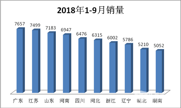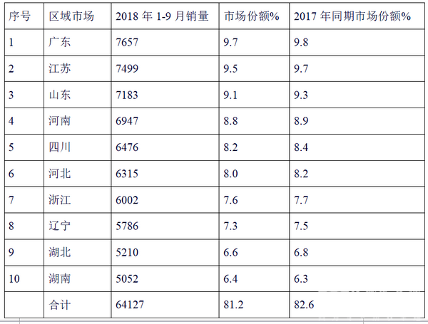 2018年前三季度座位客车产品销量在前10名的全国主流区域市场列表如下: