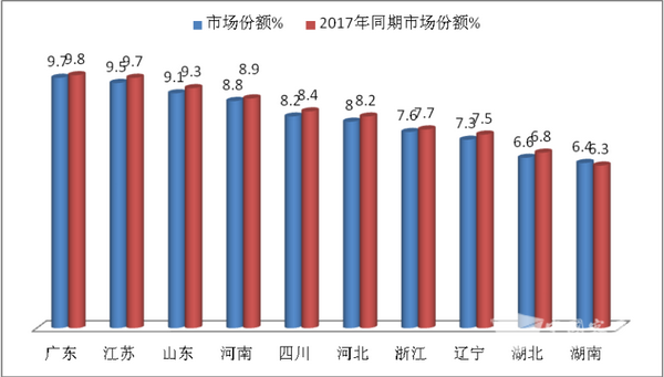 2018年1-9月,上述十大区域座位客车销量为64127辆,占据整个座位客车市场的比例为81.2%,超过80%市场集中度比去年同期(82.6%)却降低了1.4个百分点。其中广东、江苏、山东是座位客车的销量为前三名。主要原因: