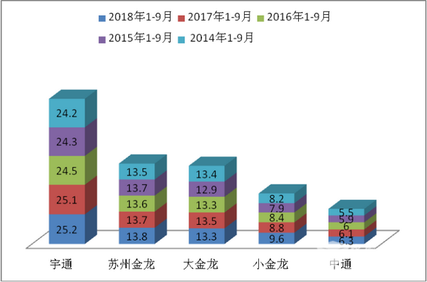 从上图表看出:在近5年1-9月中,11-12米座位客车占据座位客车市场整体的权重在逐年缩小。从2014年的21%逐年缩小到2018年的18.8%,可见大型座位客车的市场地位在逐步被消弱。主要原因是: