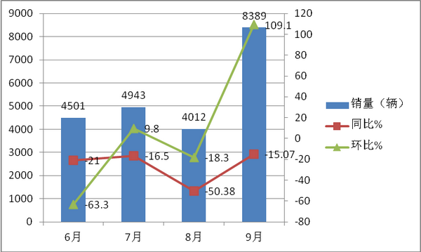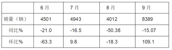 特点一:曙光初现----9月销量同环比增长109.1%,同比下降15.07%,成为自5月以来销量最多、同比下降幅度最小、环比增长最大的月份 ,前三季度销量同比增幅仍然超过20%,总体表现尚可