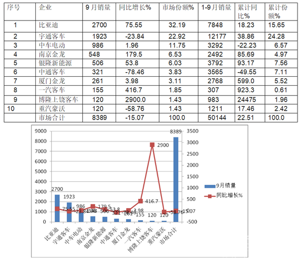 1、具体来看,本月销量冠军被比亚迪(002594)夺取,9月销售新能源客车2700辆,同比大涨75.55%,市场份额竟占到了32.19%;宇通排行第2位,9月销售新能源客车1923辆,同比下降23.84%;中车电动排行第3位,9月销售新能源客车986辆,同比增长1.96%;南京金龙和银隆新能源分别位居第4位和第5位,销量均在500辆以上,同比增幅分别为179.59%和53.8%;中通客车(000957)和厦门金龙位居第6位和第7位,与8月相比,排名略有下滑;一汽客车、江西博能上饶客车和重汽豪沃依次排行第8~第10位,其中前二者涨幅行业领先。