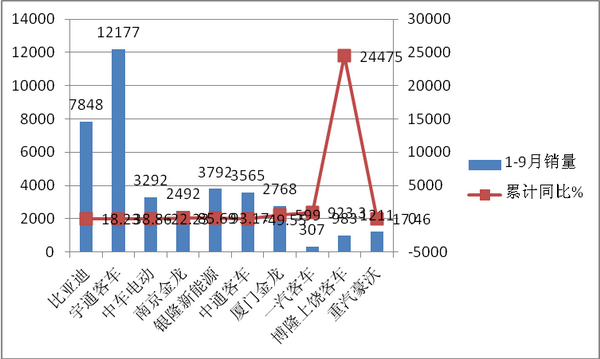 2、1-9月新能源客车累计销量来看,排行前十的企业依次为宇通、比亚迪、银隆新能源、中通客车、中车电动、厦门金旅、厦门金龙、南京金龙、重汽豪沃和苏州金龙,
