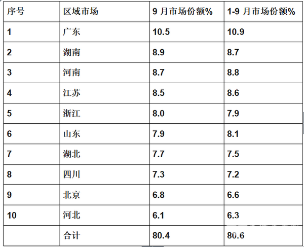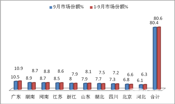 广东的新能源客车市场份额最大,其次是湖南,再次是河南;9月及1-9月前10名市场市场集中度分别达到80.4%和80.6%,其余的20个区域市场只有20%不到的市场机会.可见,2018前9月及1-9月新能源客车市场分布不均,前10名区域市场集中度较高。