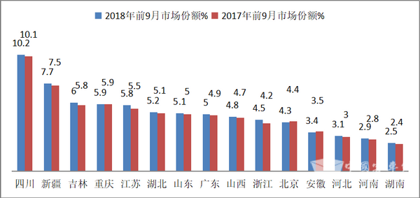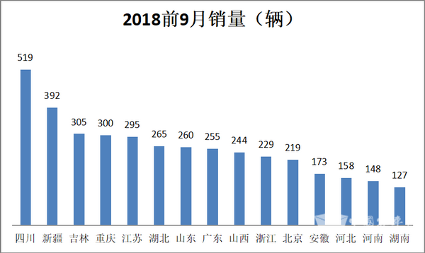 3、四川、新疆等天然气资源丰富的区域仍然是燃气类客车销量最大的区域市场。四川一家独大,市场占有率超过10%。且同比微增。