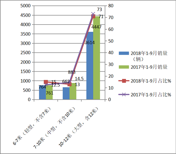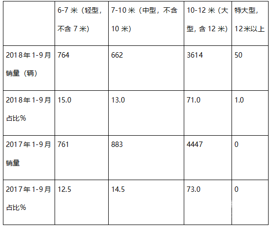 1、10-12米大型客车仍然是2018年1-9月燃气类客车市场的最大销量,其占比达到71%,且同比降低了近2个百分点。