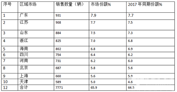 1、2018年前三季度,广东区域销量是老大,前10名区域销量集中度为65.9%,同比提高了1.4个百分点,垄断程度增强。
