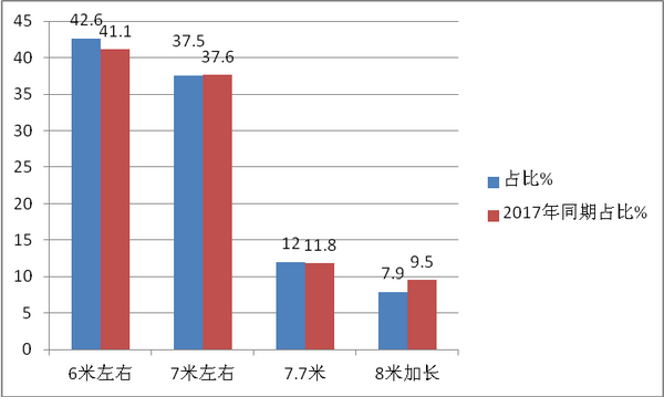 特征二、6米车型销量最多,同比权重增大1.5个百分点,7米车型基本稳定