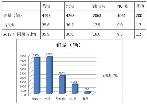 1、平分秋色的柴油、汽油燃料动力车型销量均超过35%,是两个最大的动力种类,且同比权重均下降。
