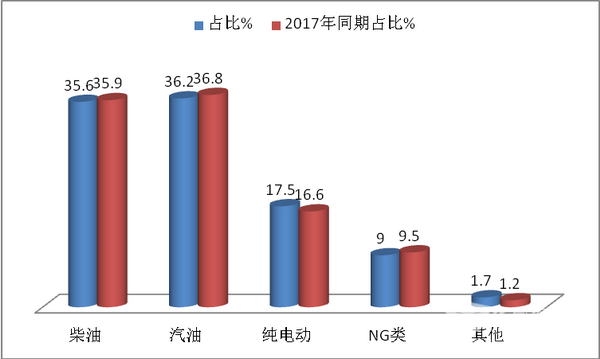 特征四:柴油、汽油几乎平分秋色,且权重最大,但同比均下降;纯电动占比上升;燃气类权重同比下降
